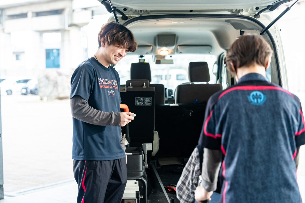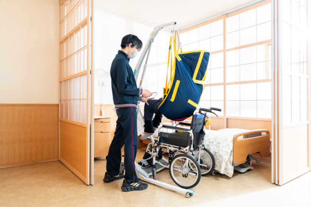 利用者さんも職員も安心できる移乗支援。腰を痛めにくく、誰でも安全にケアができる環境を整えています。